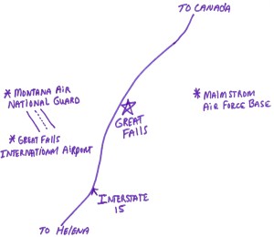 Wrong again. The F-15s are stationed at the Montana Air National Guard base which is next to the Great Falls International Airport – on the other side of Great Falls. Please review our map (again).
