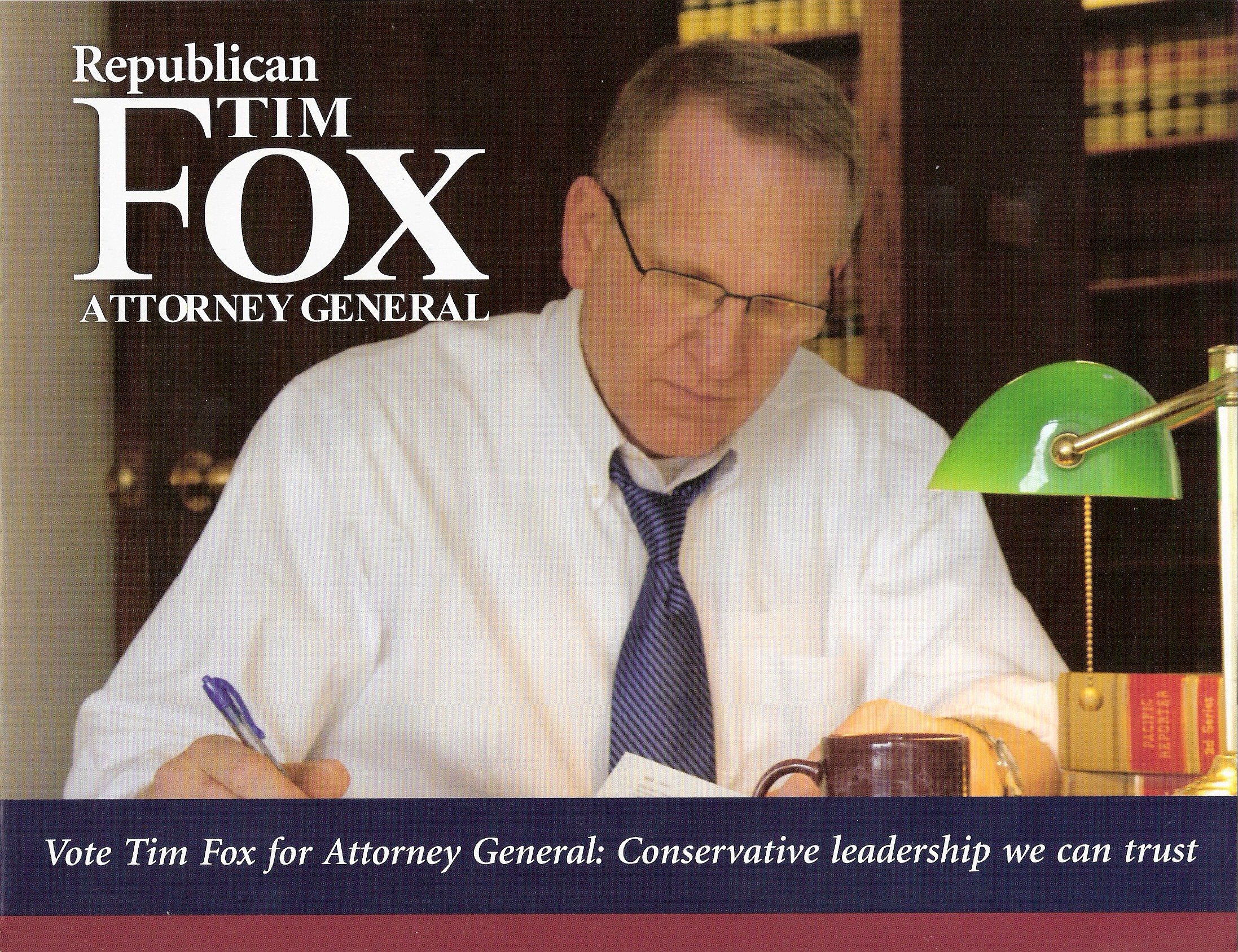 Republican Tim Fox who is running for Montana Attorney General Campaign sent primary voters a four-page 8.5″ by 11″ glossy flyer that arrived in mailboxes on Monday. The front page shows Mr. Fox working hard with tie loosened, looking busy doing something that makes him look lawyerly. In keeping with my custom to only show one page of the four, here’s the front page of the flyer:
