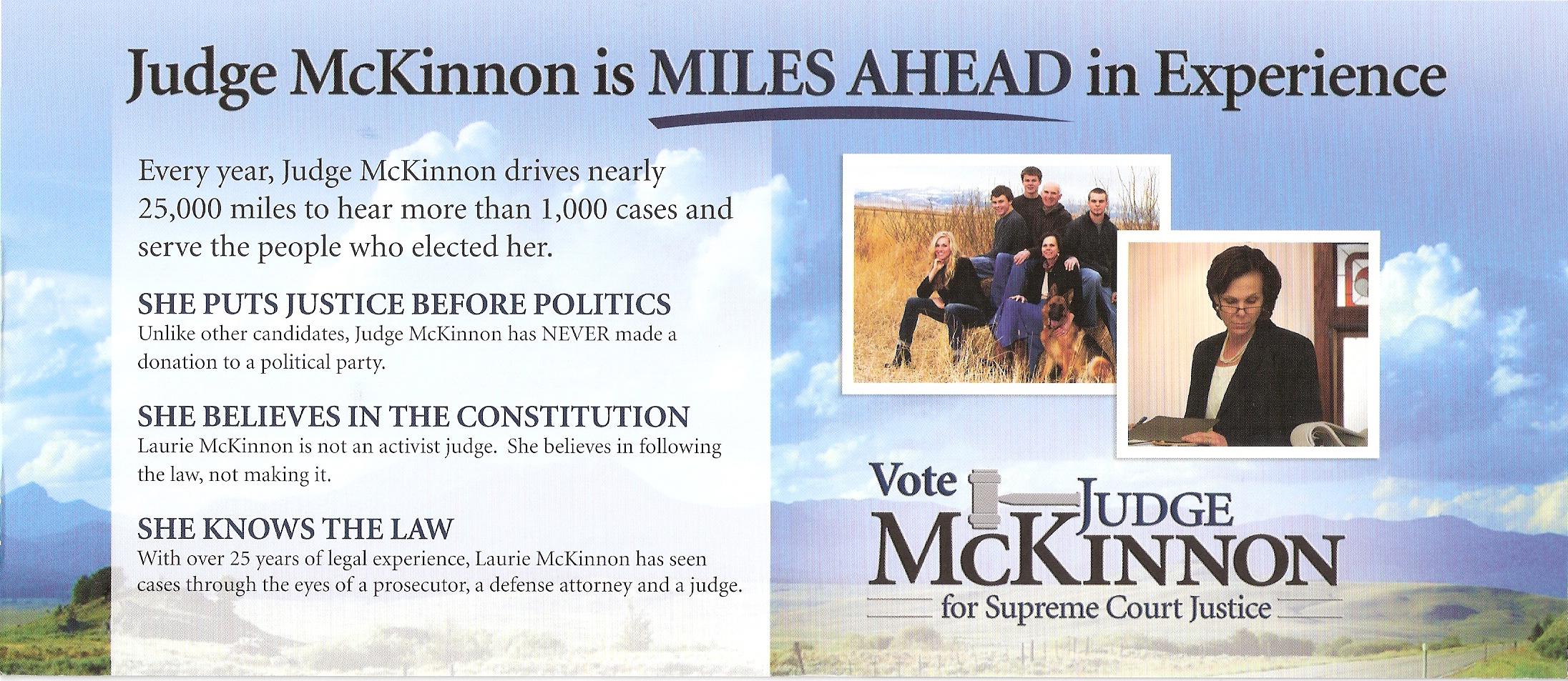 In my on-going report of how many pieces of campaign literature I receive, on Wednesday four campaign flyers hit my mailbox. This included new information from Laurie McKinnon, who is running for the Montana Supreme Court. Here’s her information: