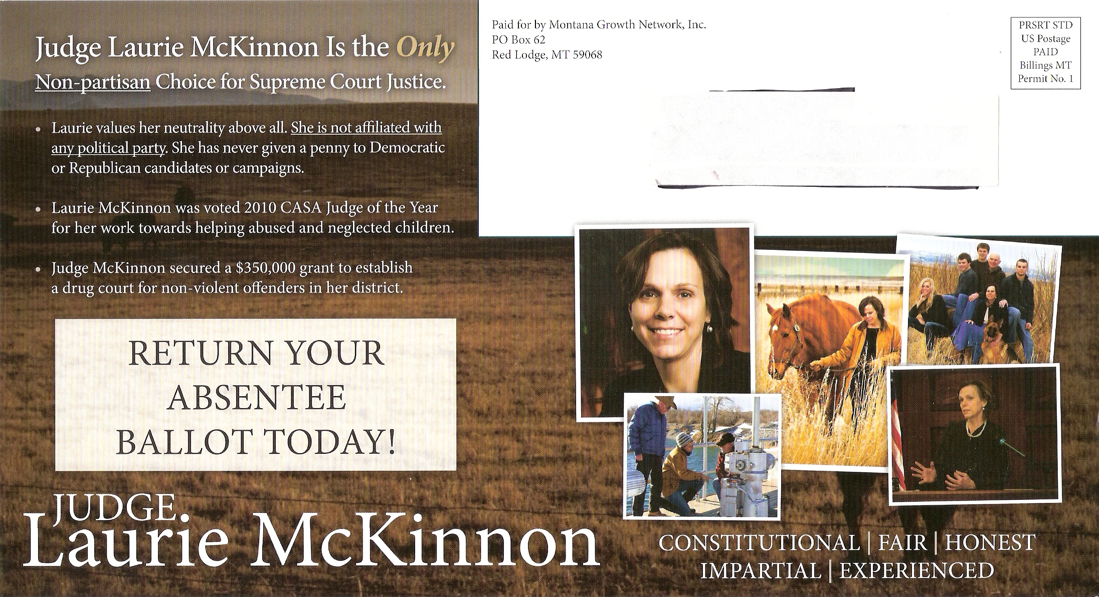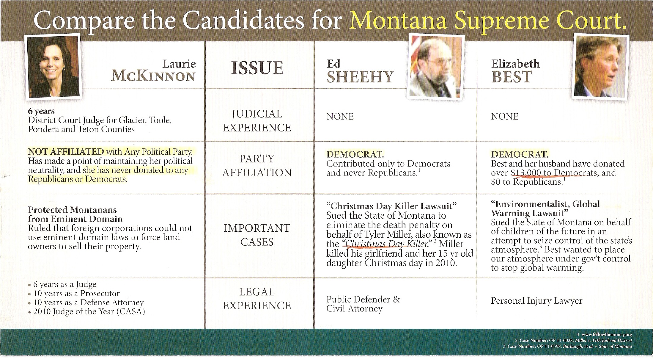 I received a flyer in the mail a few days ago telling me “Judge Laurie McKinnon is the only non-partisan choice for Supreme Court Justice” with the reverse side showing a “Compare the Candidates” chart.