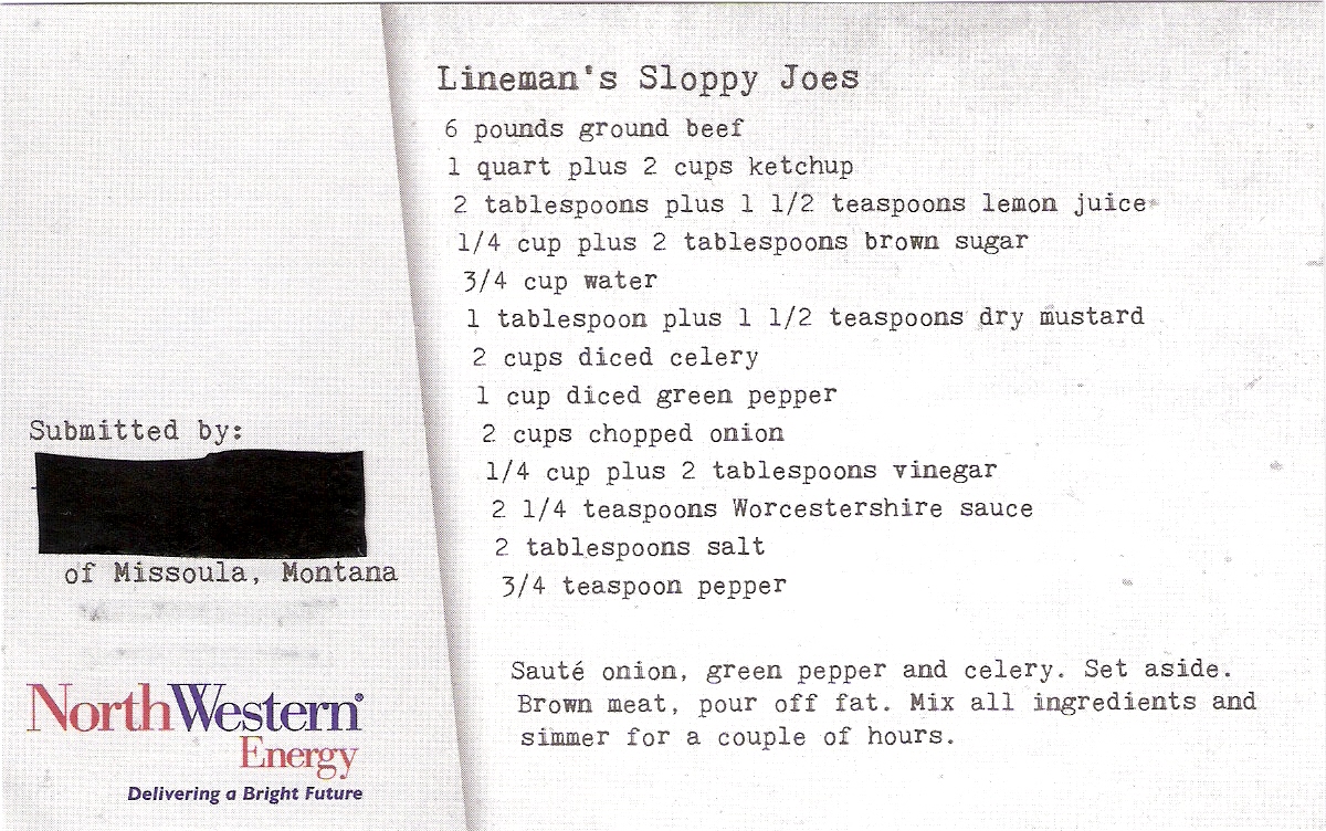 Recipes for “Lineman’s Sloppy Joes” and “Sweet Potato Salad” were on the front and back of a postcard inserted in the envelope with my bill along with their newsletter called “Energy Connections.”