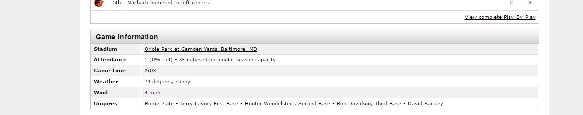 You probably heard about the baseball game between the White Sox and Orioles being closed to the fans due to security concerns in Baltimore. Some organizations reported that no fans attended the game. According to the *Box Score for the game that posted on ESPN yesterday, the attendance was 1. I snipped that part of the webpage: