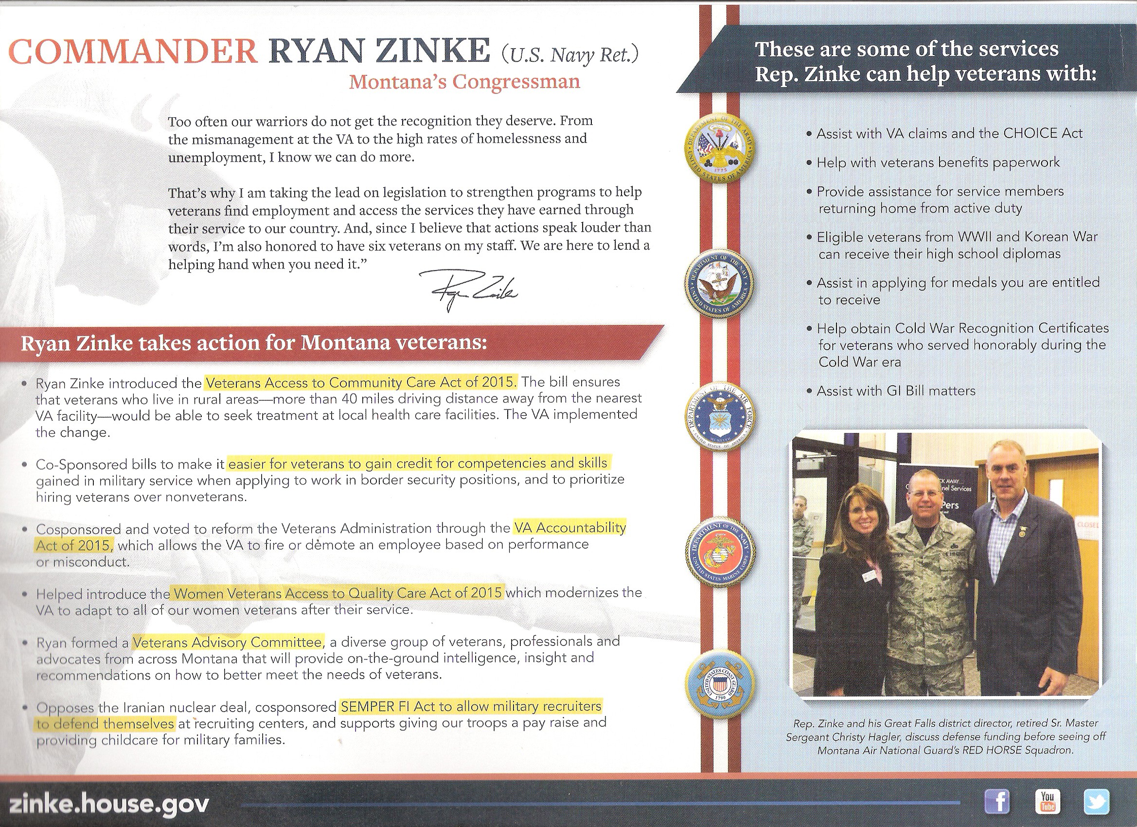 Commander Ryan Zinke (U.S. Navy Ret.) Montana’s Congressman is Dedicated to Veterans.
