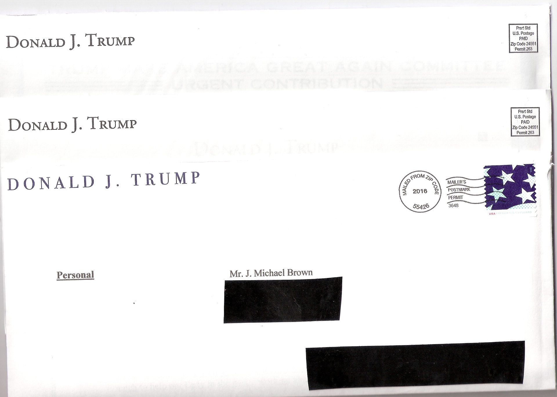 On Saturday, I once again went to the mailbox and I had TWO more letters from Donald J. Trump – no bumper stickers, but with a four-page request for money.