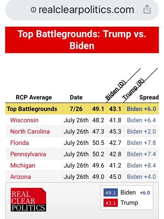 Yesterday I posted a photo of Real Clear Politics polling in six battleground states that showed Joe Biden leading by an average of six points.