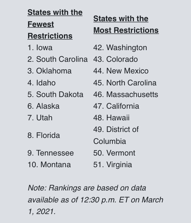 The interesting thing is that the 10 states with the fewest restrictions were won by Donald Trump in 2020. The 10 states with the most restrictions (except North Carolina) were all won by Joe Biden.