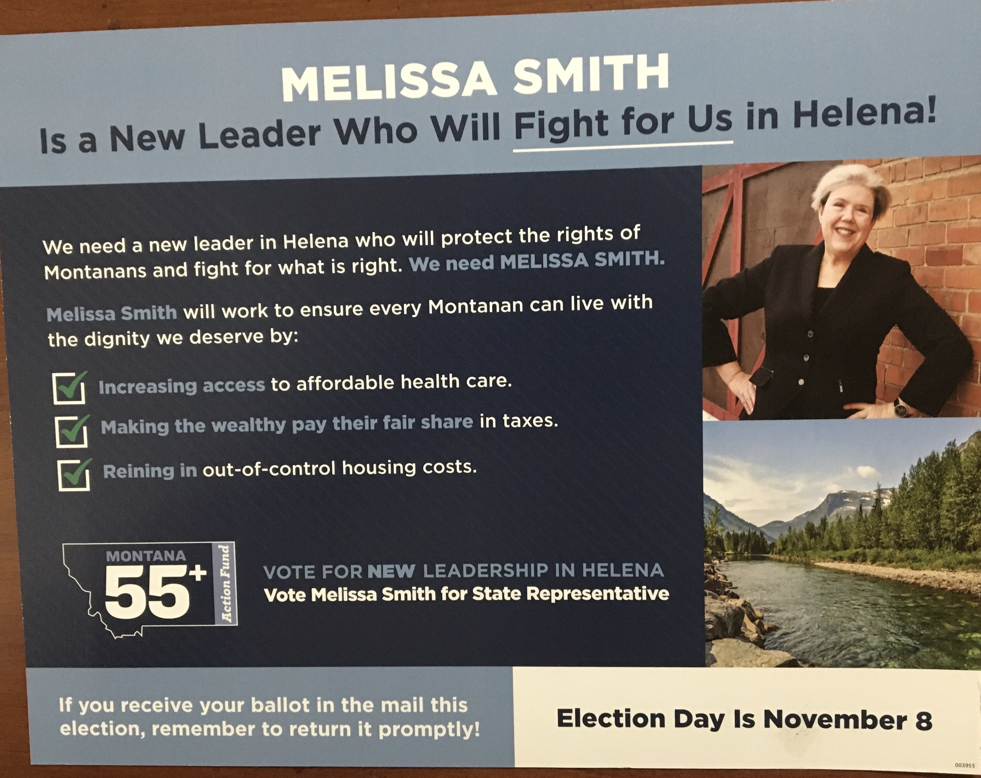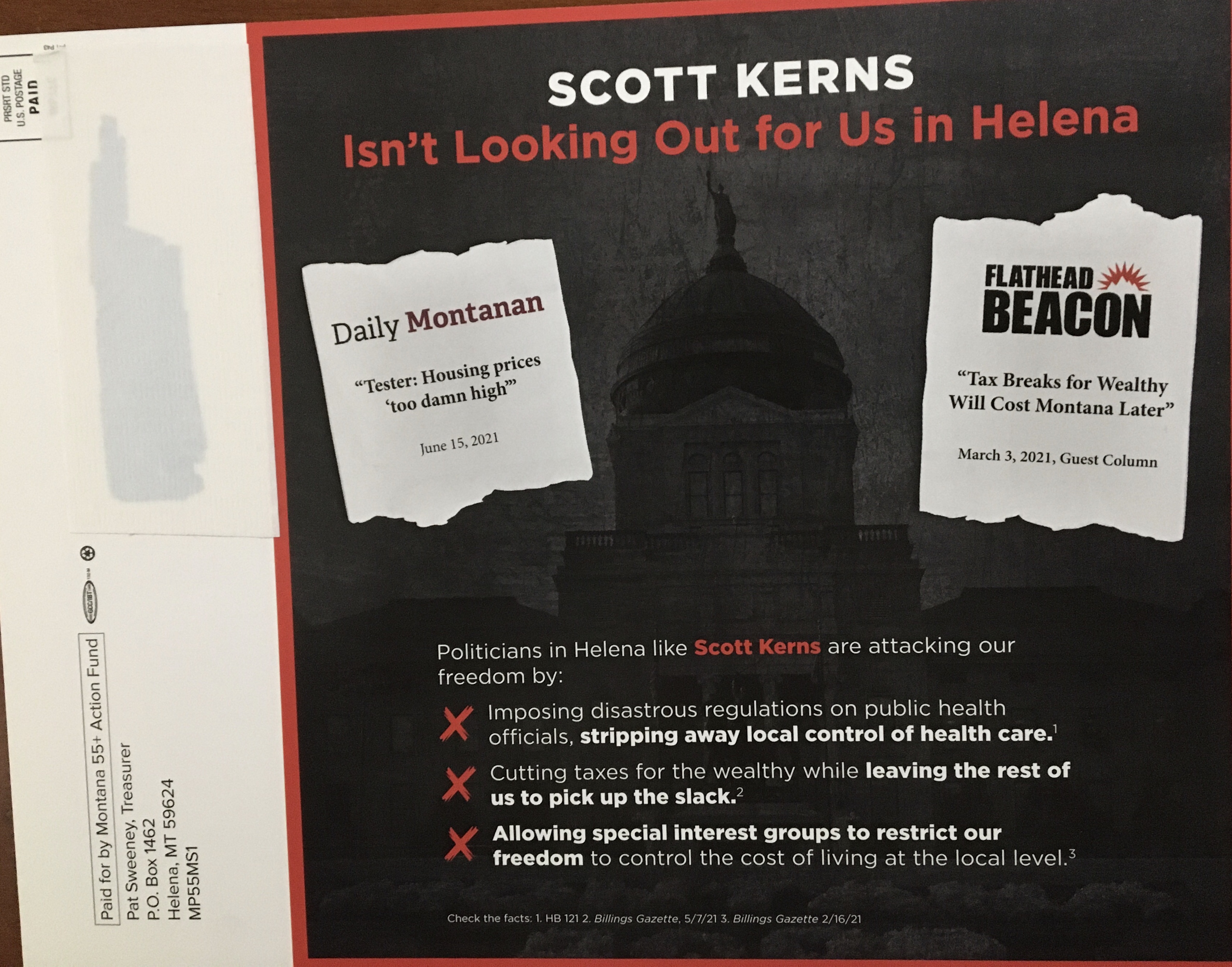 Basically, the flier says that Kerns, “Isn’t looking out for us in Helena” and that Smith “Is a new leader who will fight for us in Helena.”