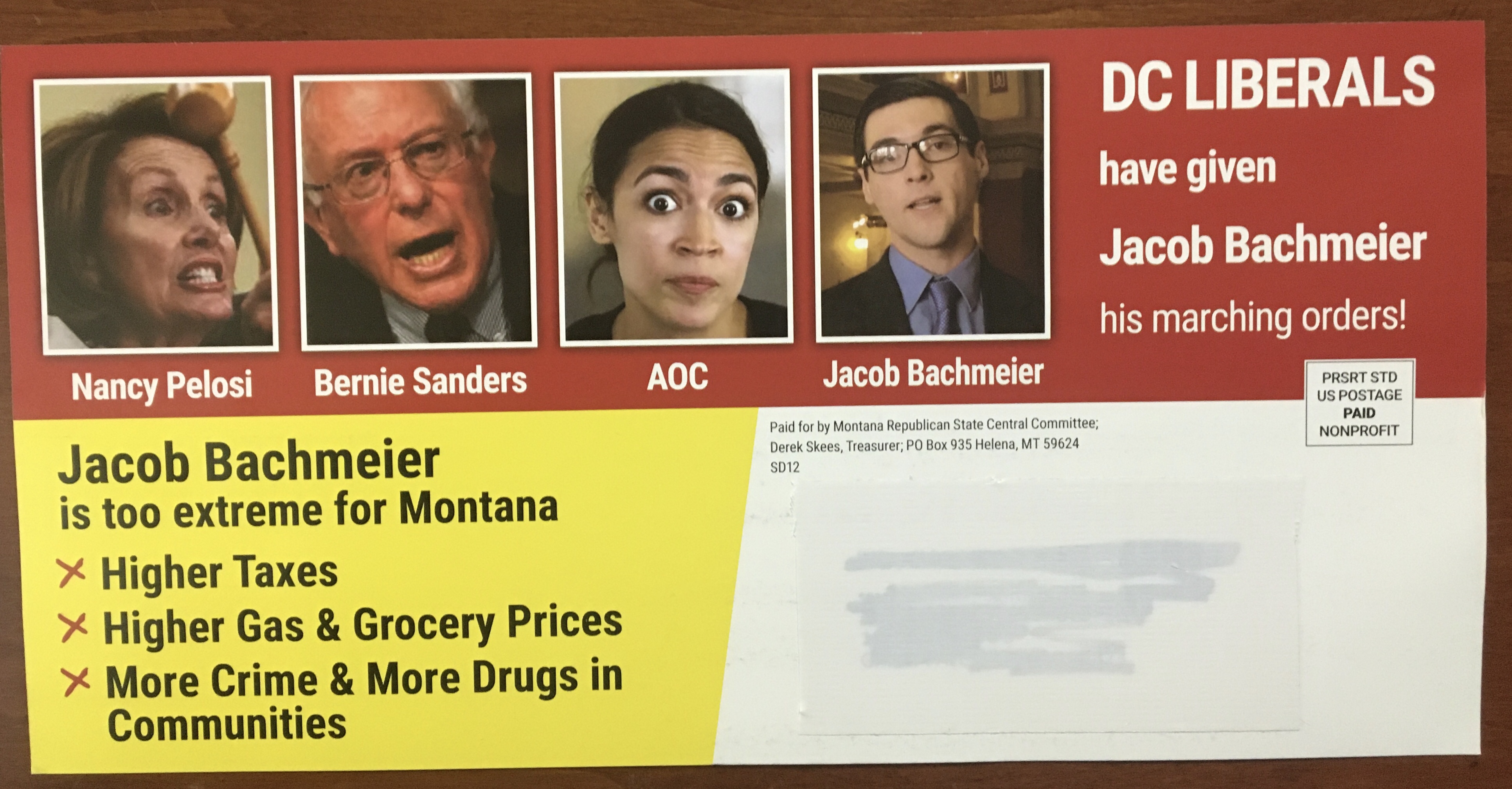 The flier was not an original, as the Montana Republican State Central Committee used the same front of the flier to attack Democrat Jacob Bachmeier in the SD 12 race.