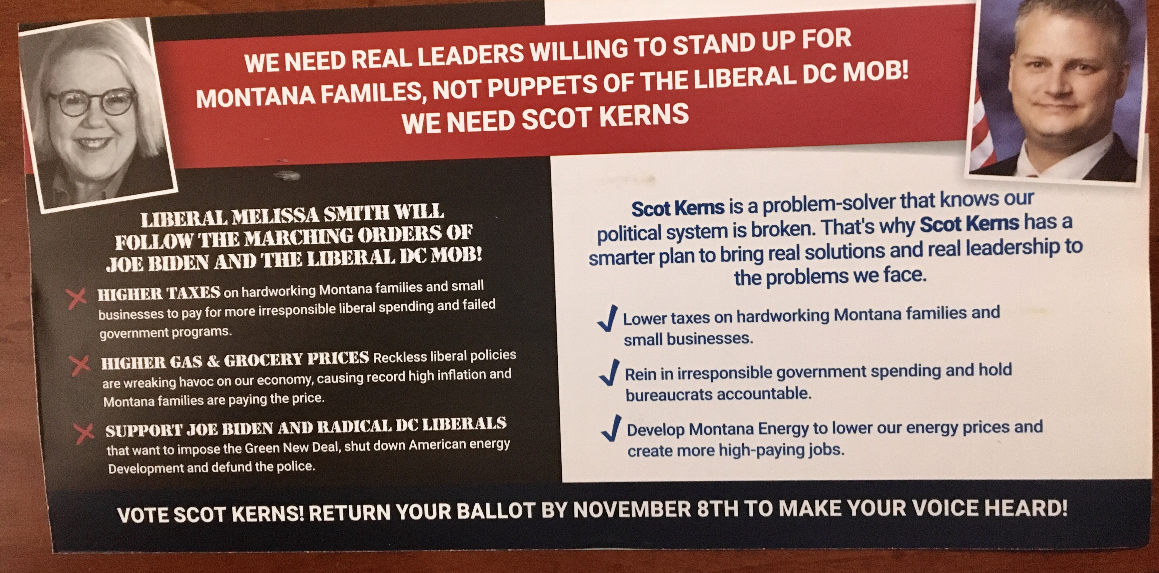 On Thursday, I received a flier from the Montana Republican State Central Committee attacking Democrat Melissa Smith in the HD 23 race and promoting Republican Scot Kerns.