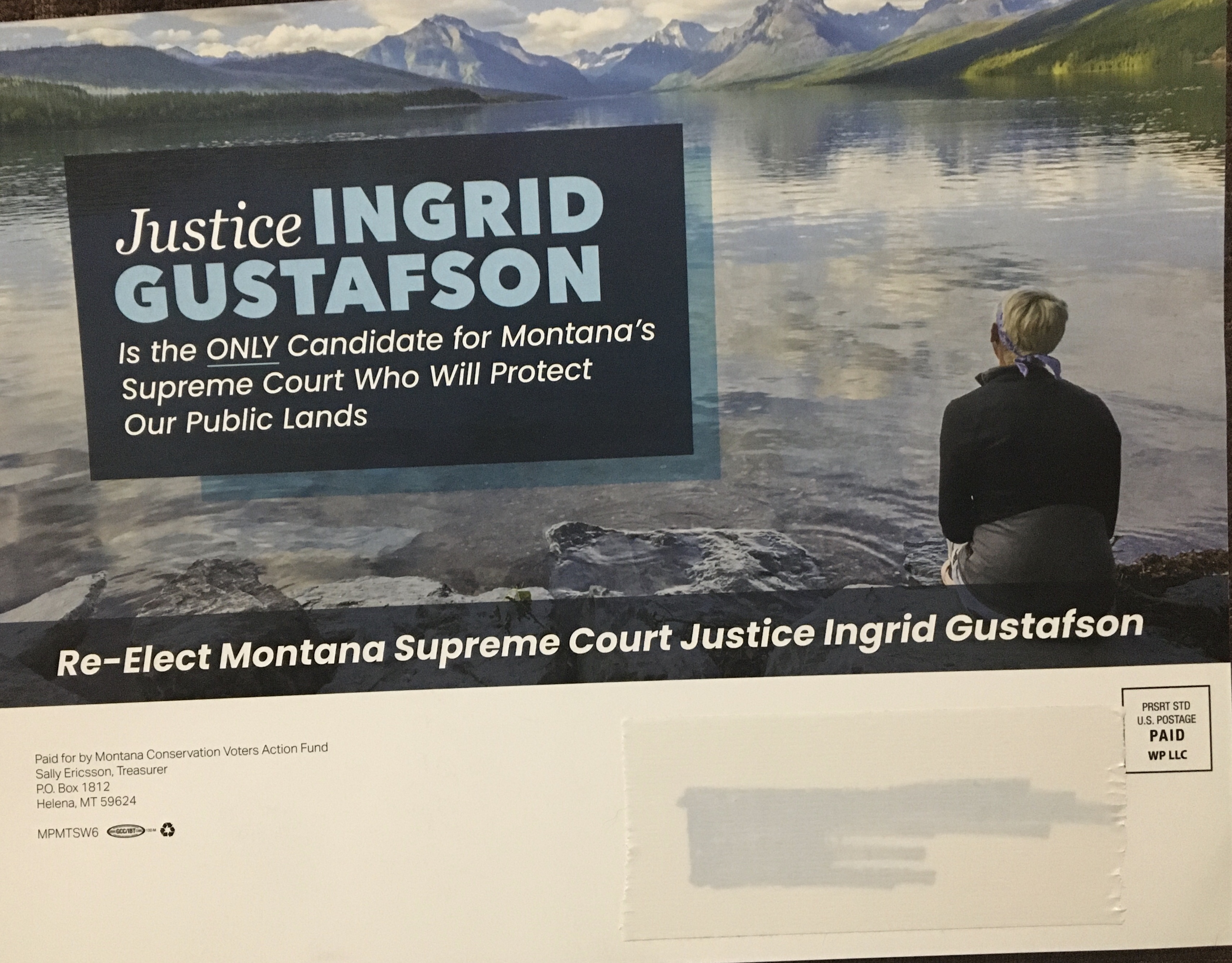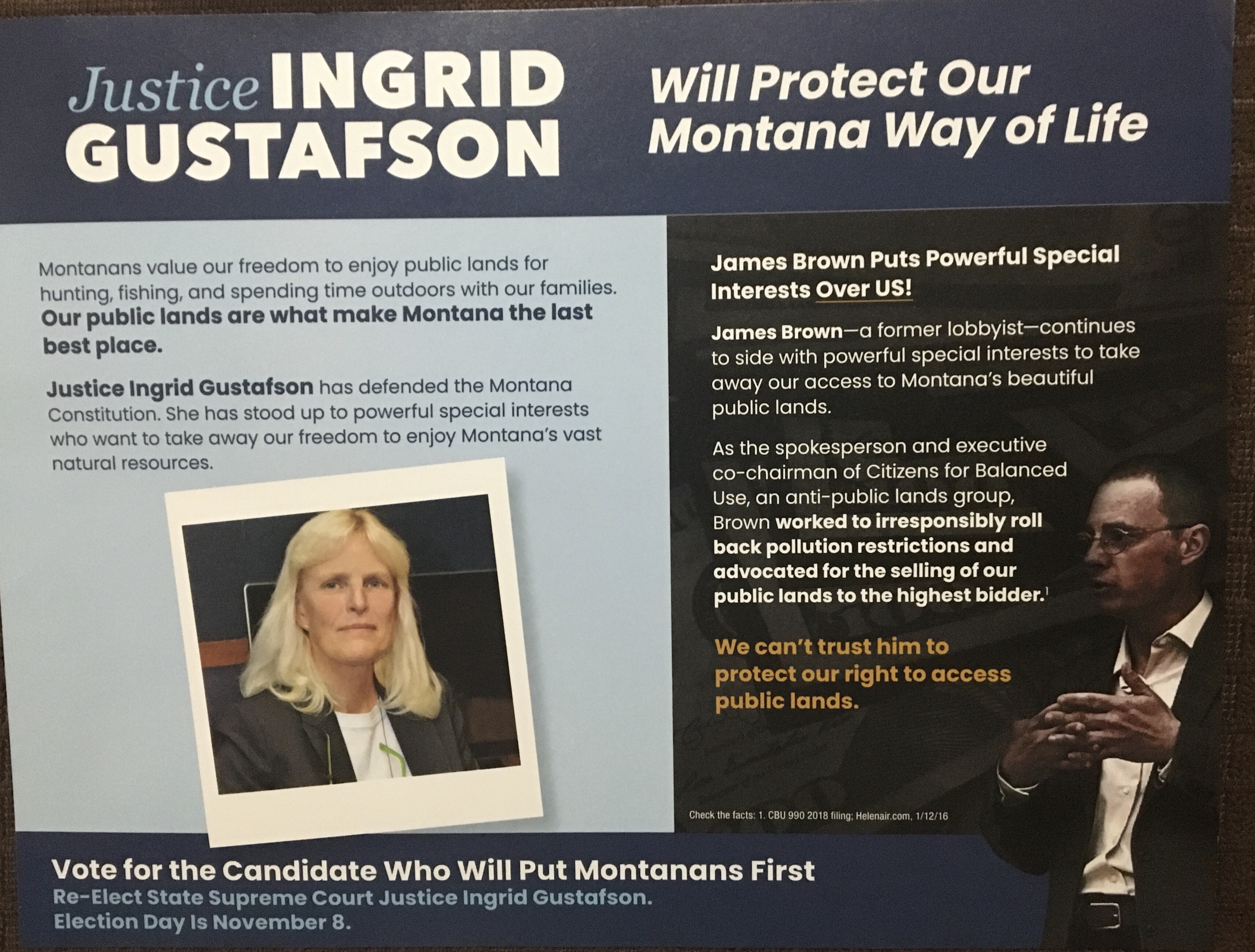 The Montana Conservation Voters Action Fund sent a flier promoting Justice Ingrid Gustafson and saying James Brown can’t be trusted to protect our right to access public lands.