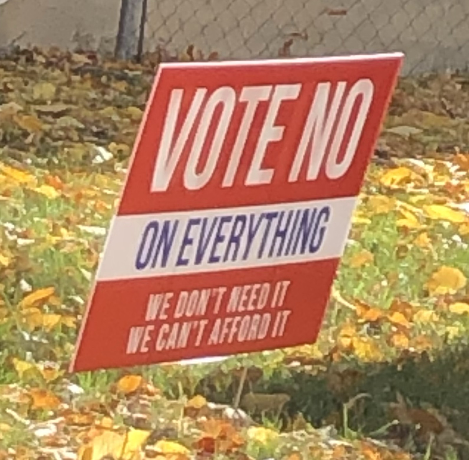 My favorite sign, so far, is THIS ONE. It says, “VOTE NO ON EVERYTHING” It then says, “We Don’t Need It” and “We Can’t Afford It.”