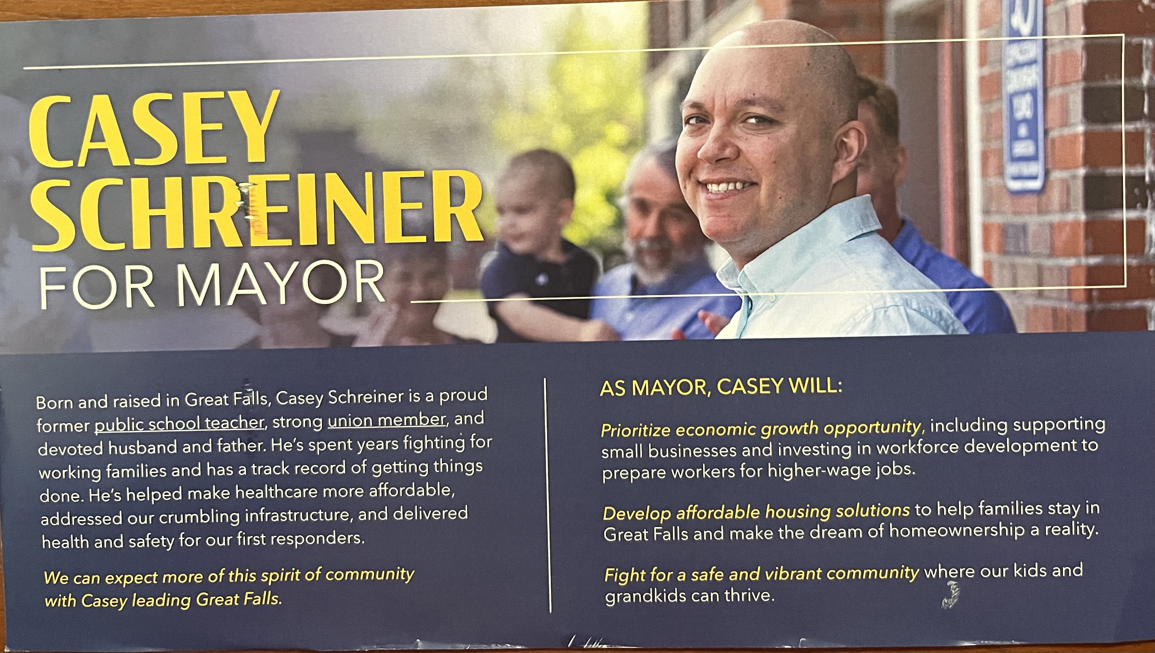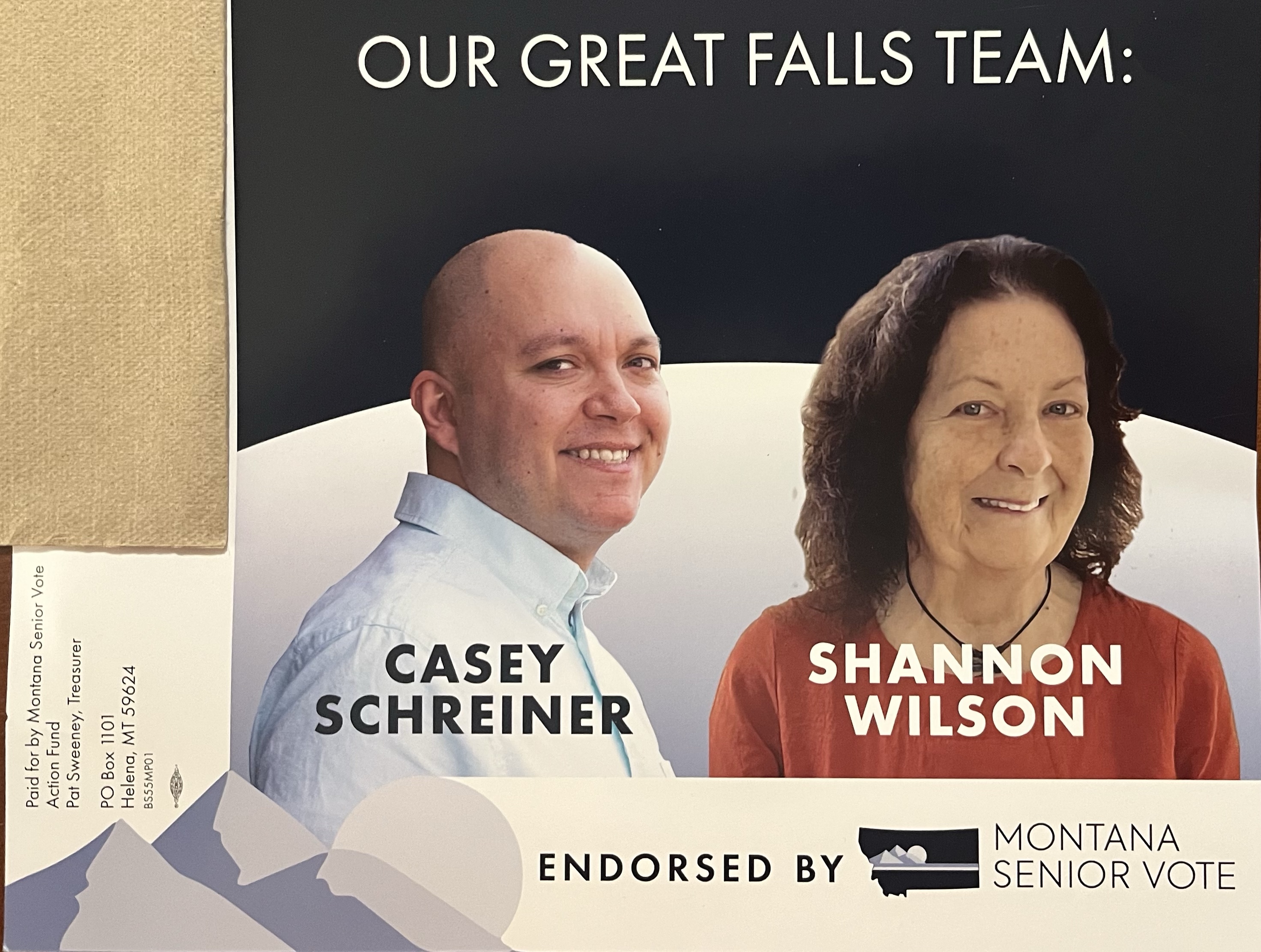 The Montana Senior Vote Action Fund sent a flyer called “Our Great Falls Team” that promotes Casey Schreiner for Mayor and Shannon Wilson for City Commission. Earlier, the Montana Rural Voters Action Fund sent a flyer promoting Schreiner.