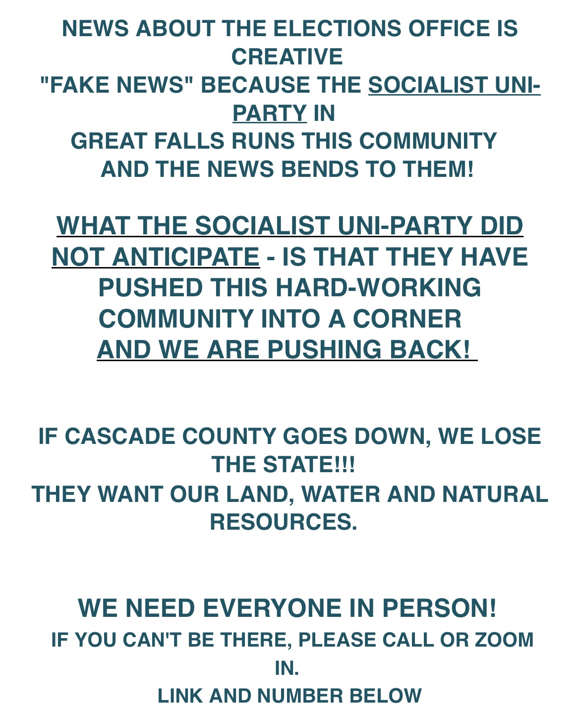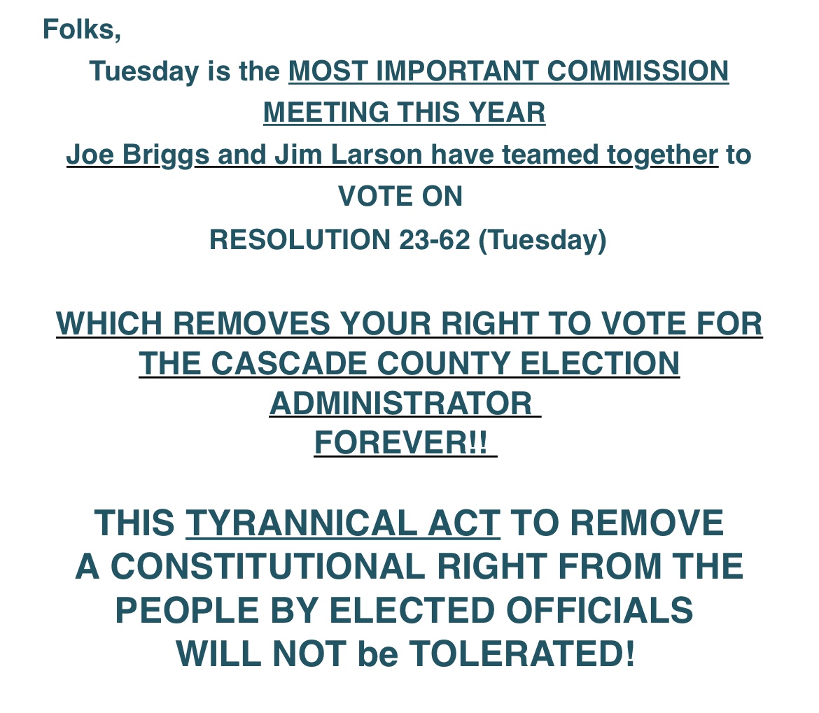 REMINDER: The Cascade County Commission meeting that will discuss a resolution removing election duties from the Clerk and Recorder’s office will be held at Exhibition Hall in Montana Expo Park. The meeting will take place at 9:30 a.m. on Tuesday, (TODAY) December 12. (Source)