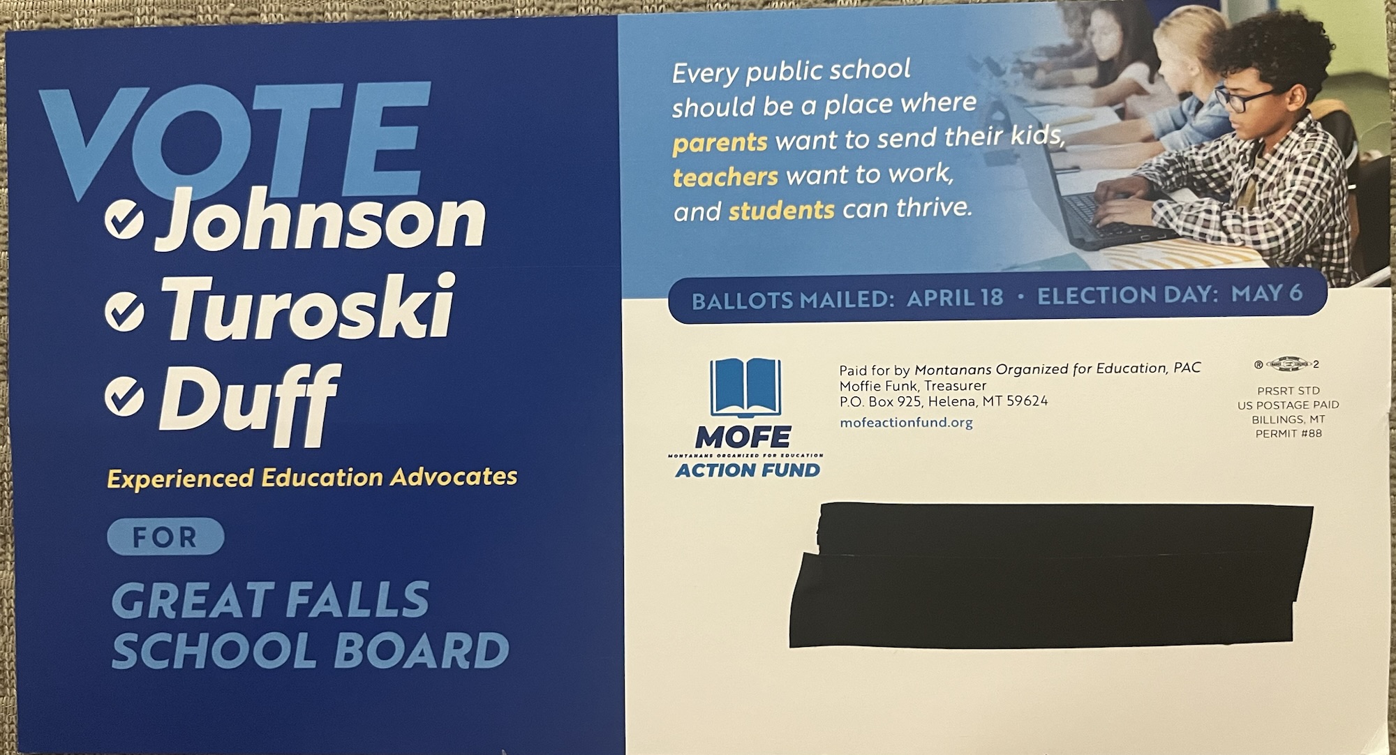 Today, I received a flyer in the mail urging me to vote for Gordon Johnson, Paige Turoski, and Craig Duff for the three positions. Montanans Organized for Education, PAC, paid for the flyer.
