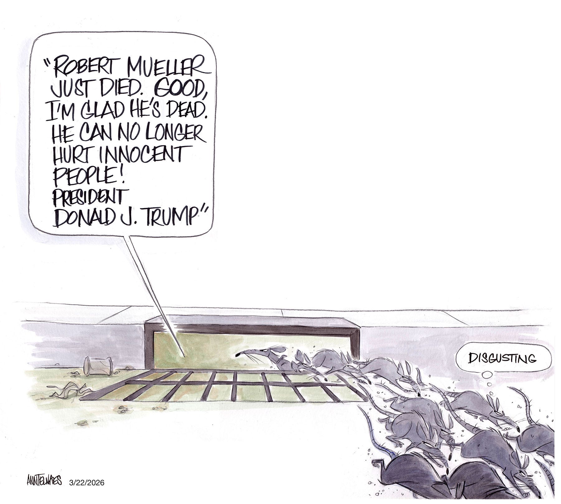 Regarding your comments on Trump’s ‘tribute’ to Mueller, I agree – but I think you softpedaled it. Ann Telnaes (formerly of the Washington Post, now on Substack) provided a more succinct response: